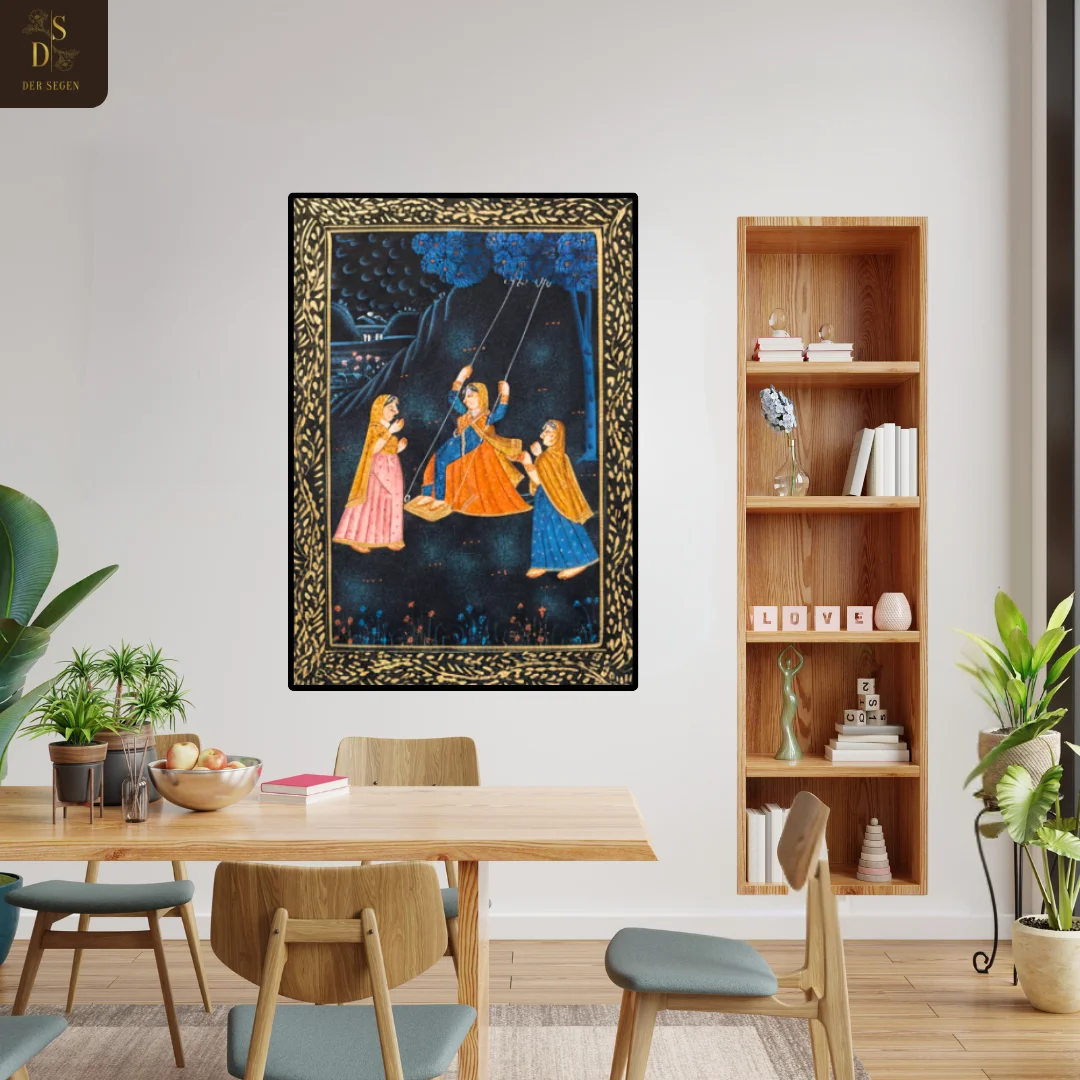Celestial Sway captures a serene moonlit moment — a graceful figure seated on a swing suspended from a flowering tree, accompanied by attendants beneath a starlit sky. The deep indigo background, crescent-lit atmosphere, and intricate gold ornamental border create a powerful visual contrast that defines traditional miniature discipline.