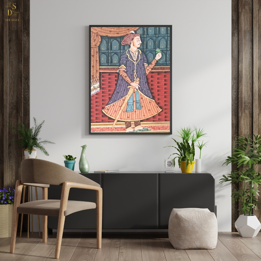 Rooted in classical Indian miniature traditions, the artwork showcases meticulous brushwork, layered architectural detailing, and a carefully balanced color palette. Deep reds, muted greens, and earthy browns create a dignified visual rhythm, while the patterned backdrop and flowing garments emphasize order, hierarchy, and inner resolve. Every elementâfrom posture to ornamentationâcontributes to a narrative of leadership shaped as much by thought as by command.