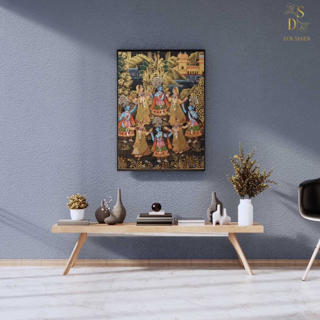 Moksha in Motion by Der Segen is a handcrafted 8” x 6.5” miniature painting on fabric depicting a classical Raas dance scene under a moonlit sky. This traditional Indian miniature artwork features intricate gold detailing, balanced circular composition, layered temple landscape, and refined brush precision — ideal for collectors of devotional and heritage miniature art.