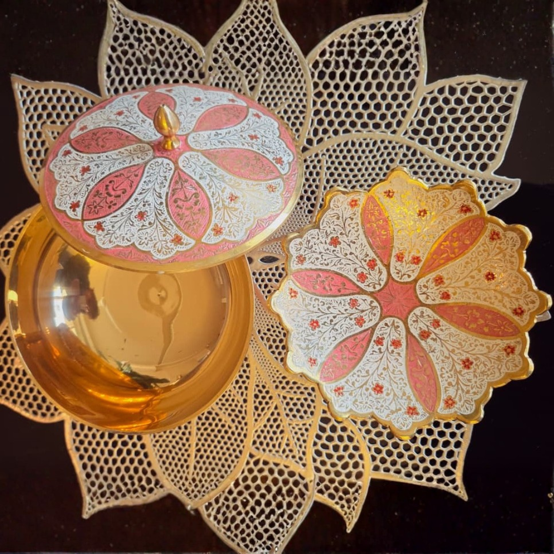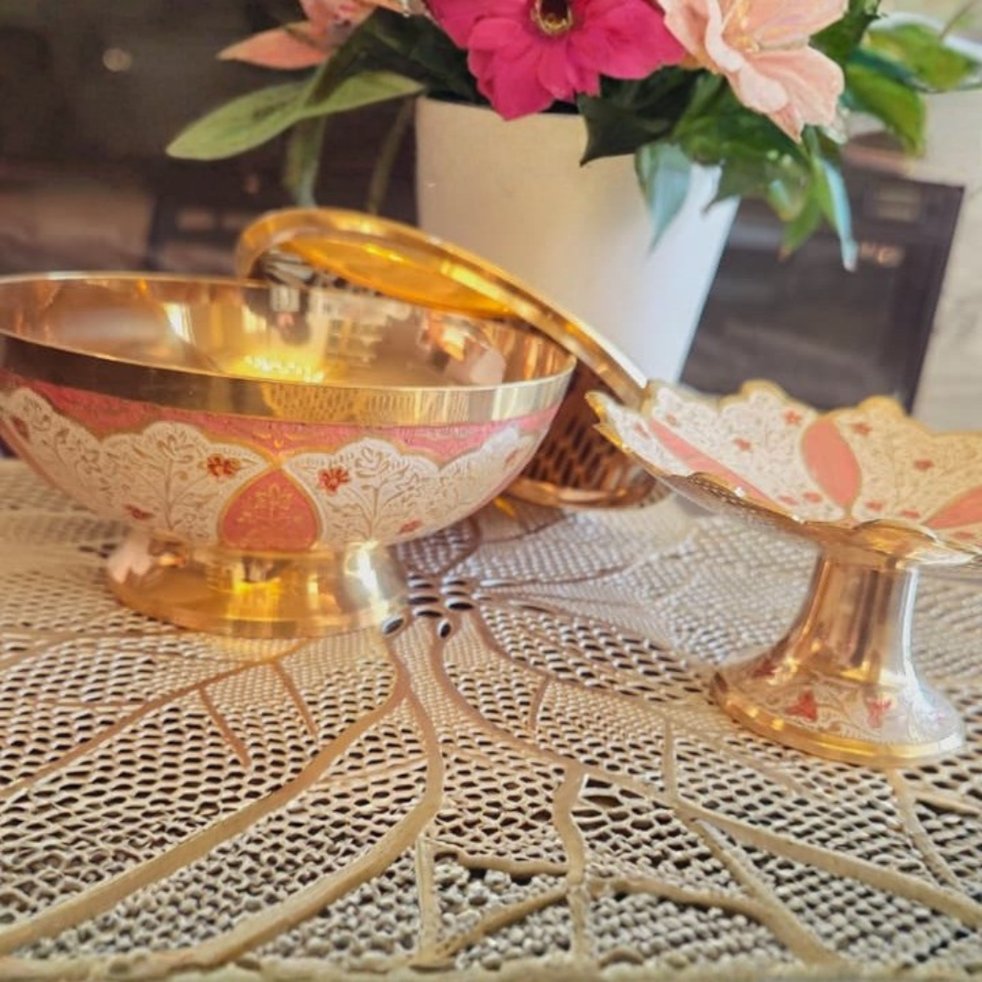 Inspired by blooming petals, the bowl and platter feature soft pastel tones accented with fine enamel patterns. The raised form and polished brass interior enhance both visual depth and usability, making Pushpika a versatile piece for rituals, festive serving, and decorative styling.