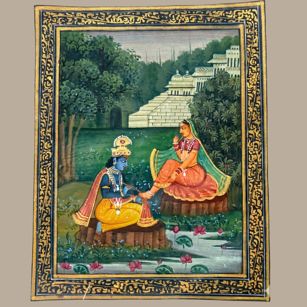 The artwork reflects the hallmark elements of traditional Indian miniature painting—precise brushwork, layered detailing, and symbolic use of color. Krishna’s calm posture, Radha’s expressive gesture, and the carefully constructed architectural background together evoke a mood of quiet devotion and timeless romance. The rich greens, warm ochres, and soft blues are balanced harmoniously, making the scene visually soothing yet narratively powerful.
