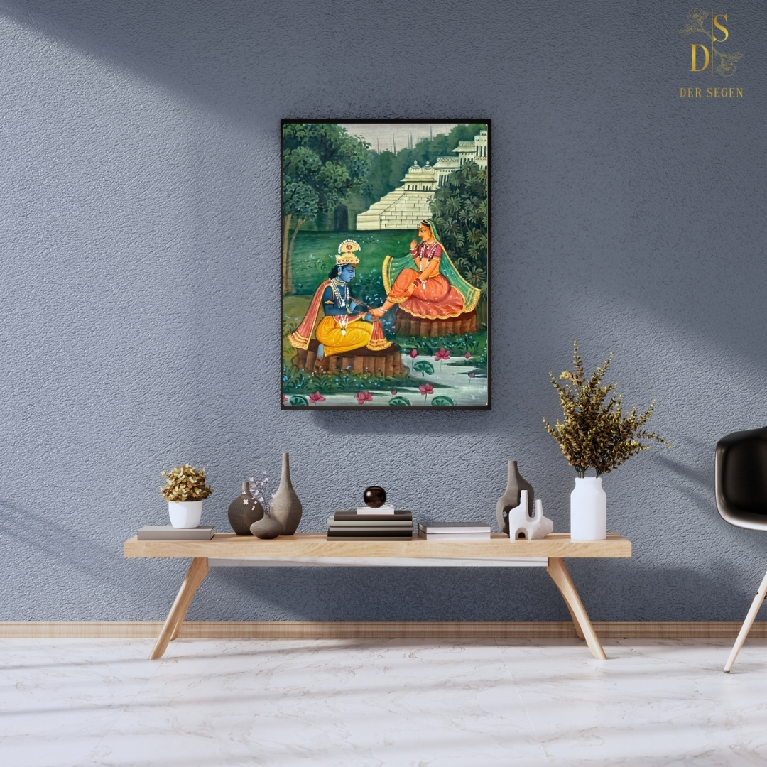 The artwork reflects the hallmark elements of traditional Indian miniature painting—precise brushwork, layered detailing, and symbolic use of color. Krishna’s calm posture, Radha’s expressive gesture, and the carefully constructed architectural background together evoke a mood of quiet devotion and timeless romance. The rich greens, warm ochres, and soft blues are balanced harmoniously, making the scene visually soothing yet narratively powerful.