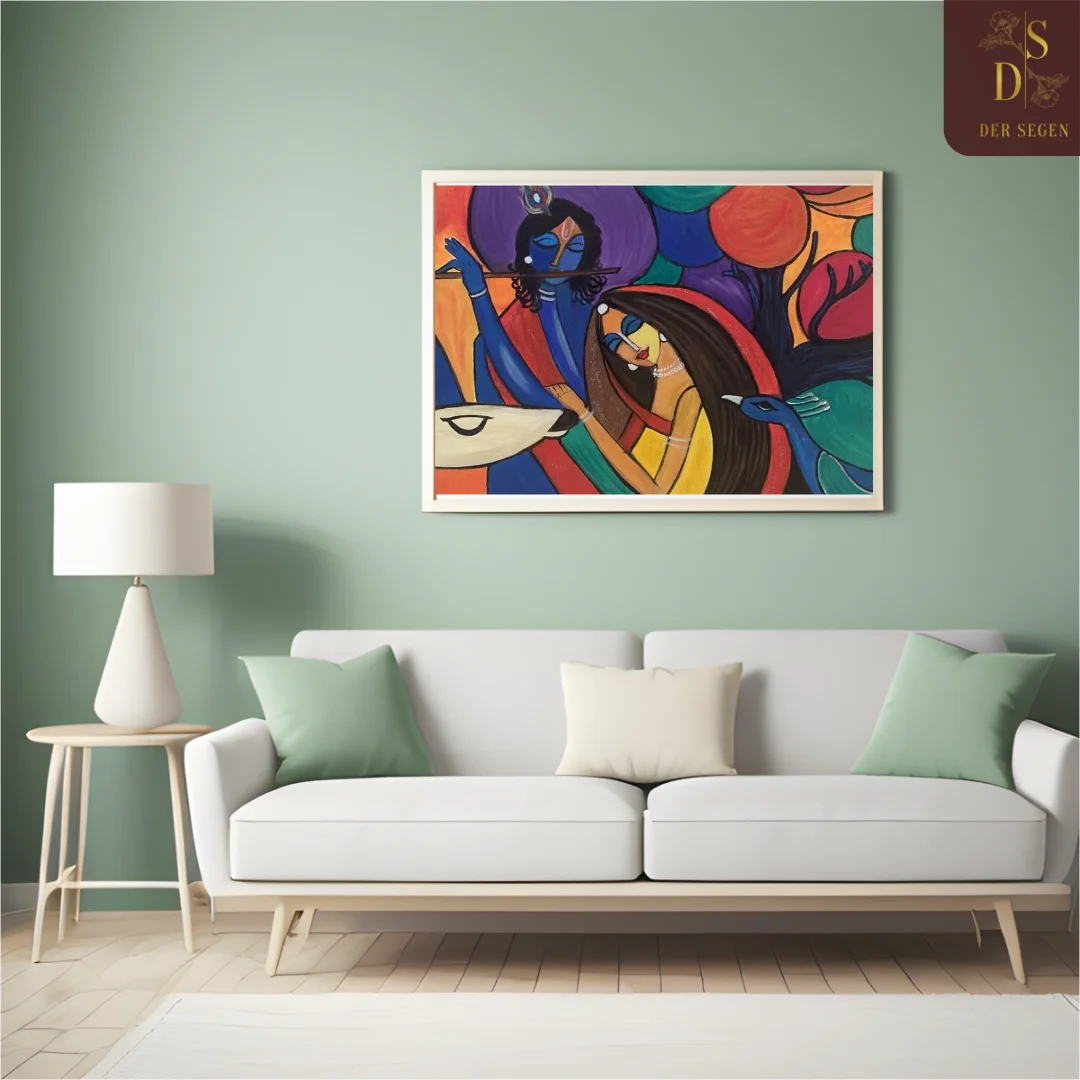 A contemporary reinterpretation of Radha and Krishna, this artwork uses bold shapes and stylized forms to present a timeless narrative in a modern visual language. The colors are intentionally vivid, creating contrast and emotional impact.