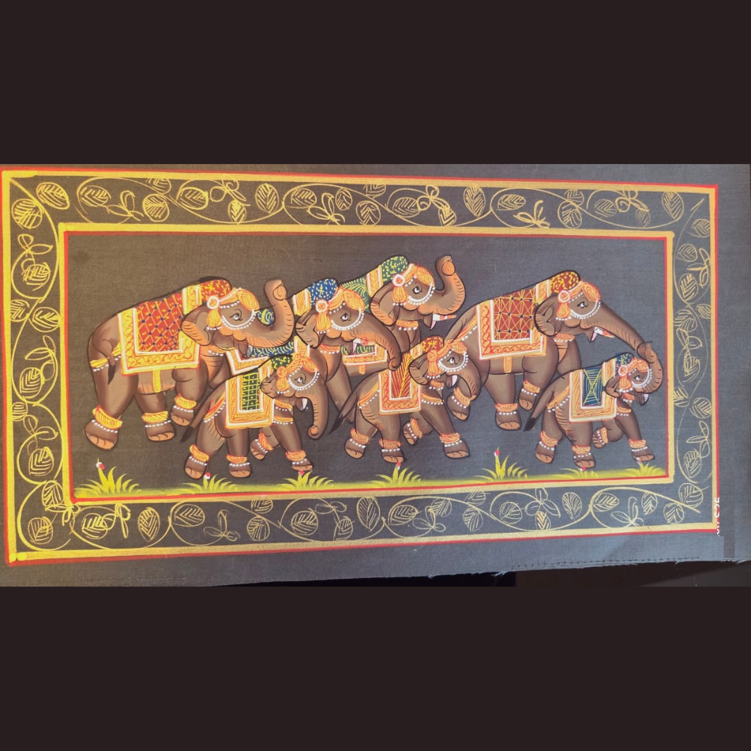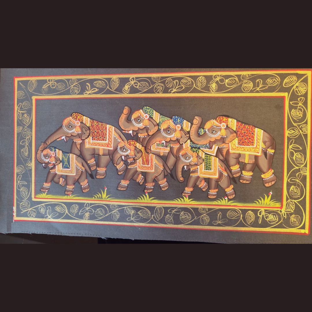 Royal Rhythm is a handcrafted Indian miniature painting set that captures the synchronized movement and ceremonial grace of royal elephant processions. Rooted in traditional miniature art, this artwork reflects rhythm, balance, and regal discipline through finely detailed brushwork and harmonious composition.