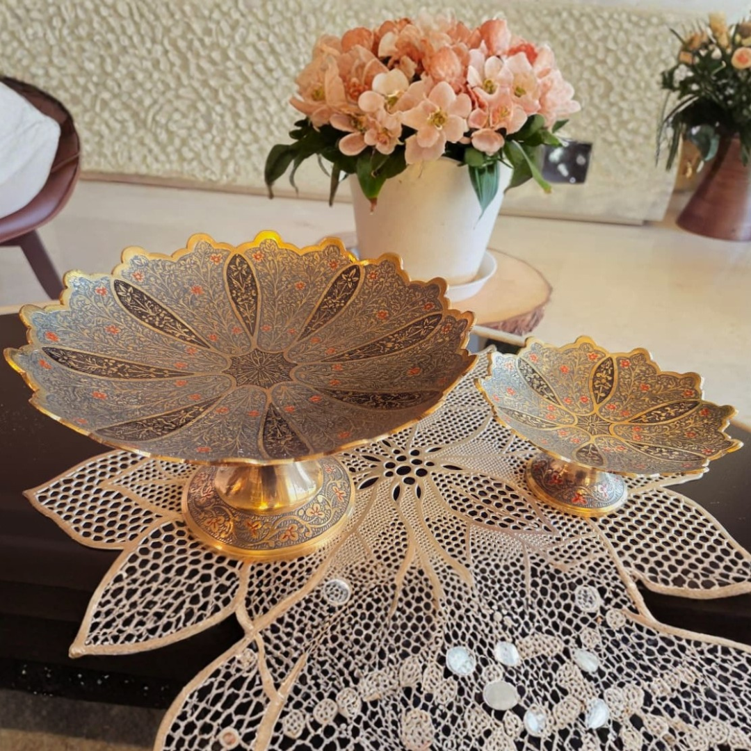This two-piece set includes a larger platter for commanding presentation and a smaller companion platter for balance and versatility. Together, they allow thoughtful arrangement—whether used for festive offerings, puja rituals, sweets, dry fruits, or as decorative centerpieces. The graduated sizing adds dimension and harmony, ensuring the set feels intentional rather than ornamental.