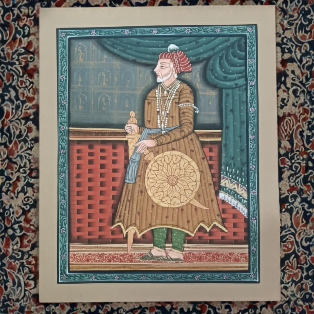 The artist employs a balanced palette of earthy browns, deep greens, and muted reds, harmonized with soft teal borders and architectural backdrops. These elements frame the figure with structure and symmetry, reinforcing the sense of order and discipline that defines the subject. Fine linework, delicate facial expression, and layered garments reveal the hallmark precision of traditional miniature painting, where every detail contributes to narrative depth.