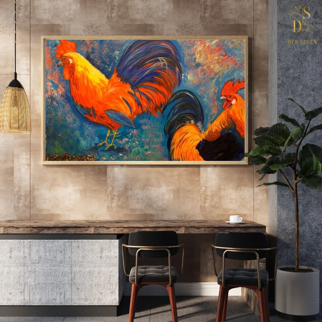 A bold and energetic depiction of two roosters, symbolizing vitality, competition, and rural life. The composition uses strong contrasts and dynamic strokes to create movement and tension.