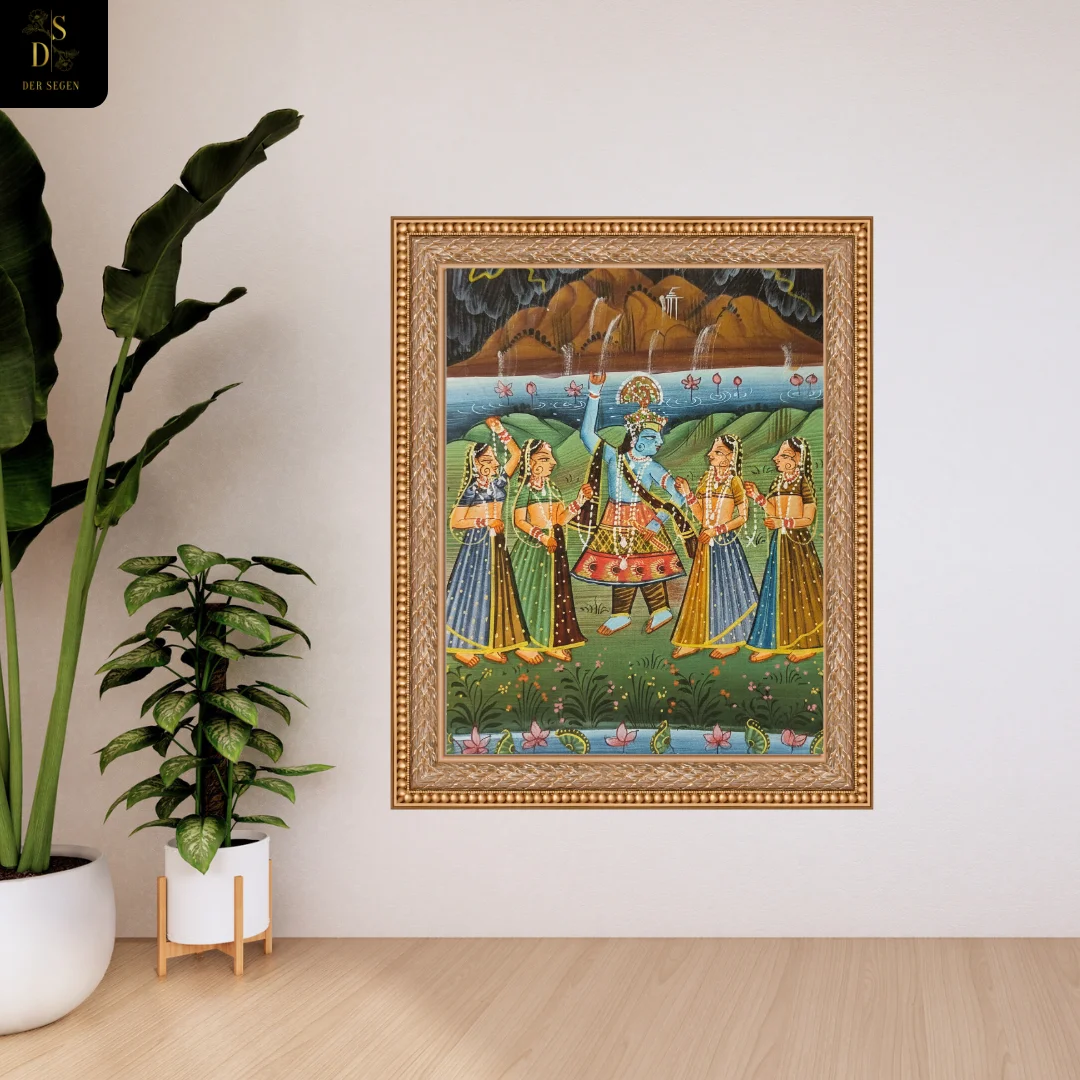 Vrindavan Raas captures the timeless devotional Raas scene set against the serene Yamuna landscape. At the center stands the divine blue-toned figure, surrounded by elegantly adorned companions in rhythmic formation. Rolling green hills, lotus-lined waters, and dramatic monsoon clouds build layered depth while reinforcing the spiritual atmosphere of Vrindavan.