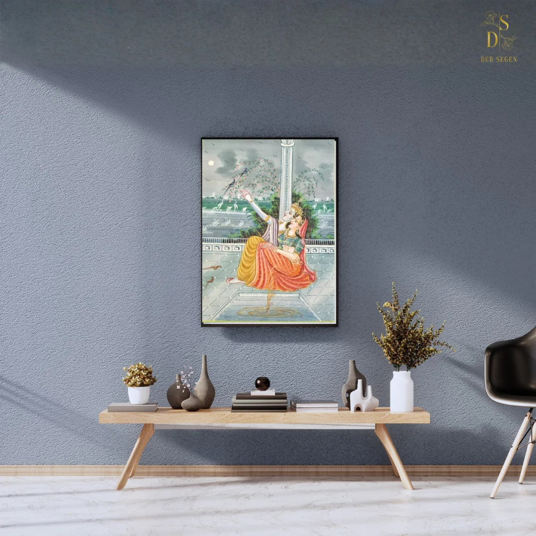 Whispers by the Water is a handcrafted Indian miniature painting that captures an intimate moment of quiet joy and poetic expression beside a tranquil waterbody. Rooted in classical Indian miniature traditions, the artwork reflects romance, serenity, and the gentle dialogue between human emotion and nature.