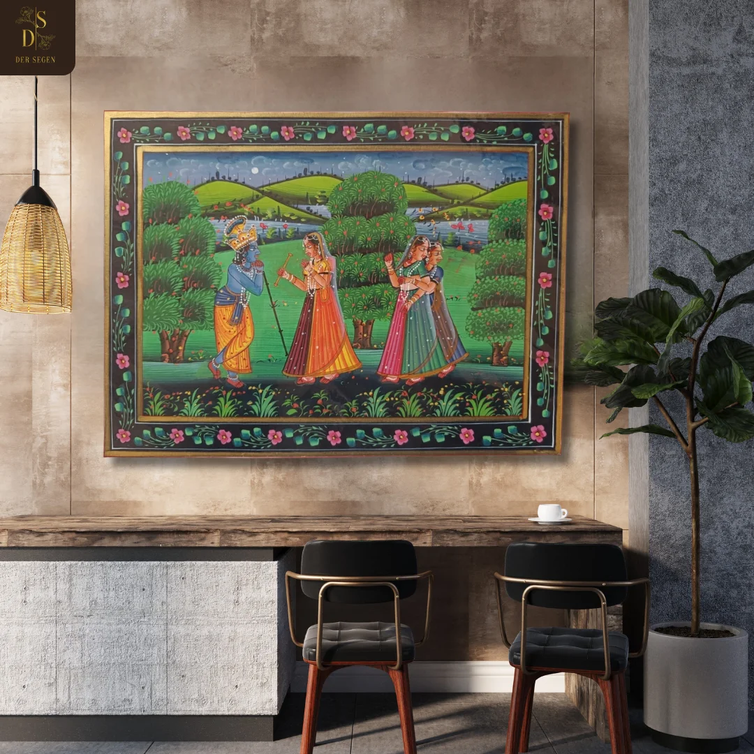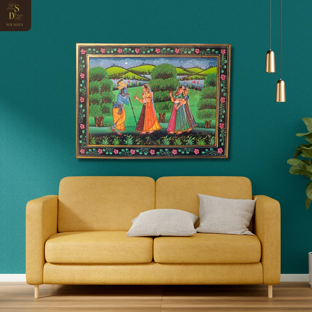 Whispers of Heart captures a timeless romantic exchange set within a serene pastoral landscape. The composition portrays a divine blue-toned figure interacting with elegantly draped companions, framed by lush greenery, flowing water, and rolling hills beneath a textured sky. The ornate floral border encloses the narrative, reinforcing traditional miniature discipline.