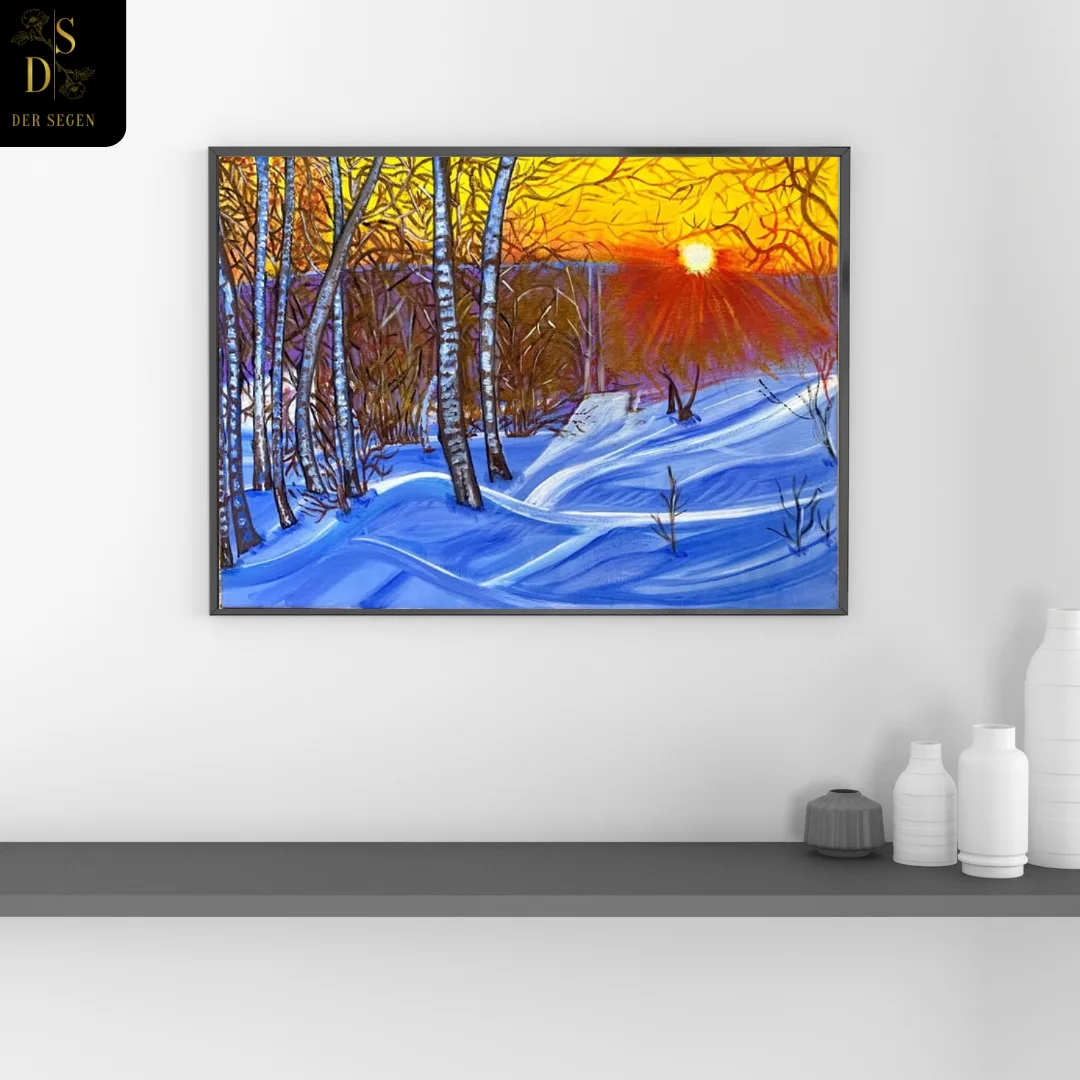 This serene winter landscape captures stillness and silence through a delicate balance of cool blues and warm sunlight. The contrast creates depth while maintaining a calm, meditative quality.