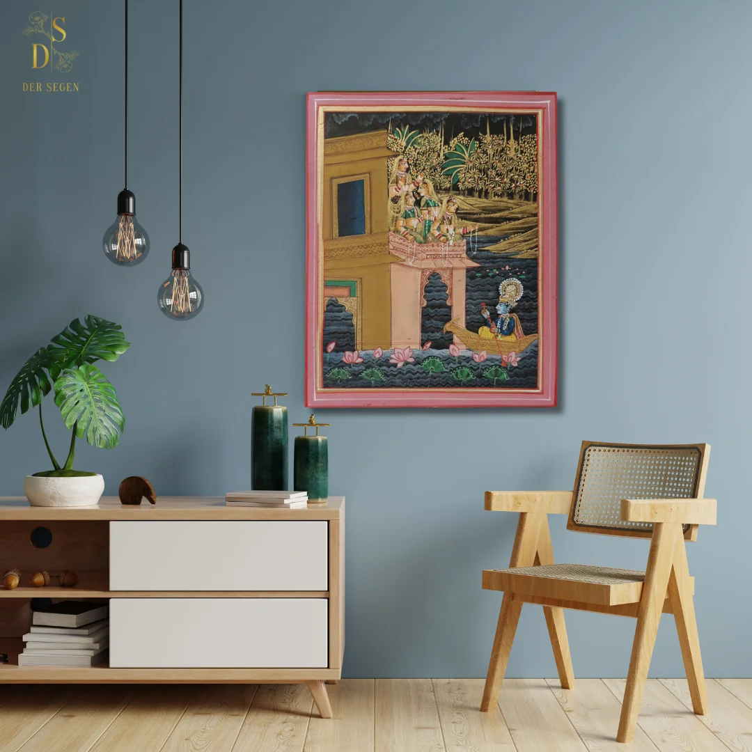 Yamuna Banks captures a poetic devotional moment set along the tranquil waters of the Yamuna. A divine blue-toned figure glides across the lotus-lined river in an ornate golden boat, while elegantly adorned companions observe from a palace balcony above. The layered nightscape, dense foliage, and architectural framing create depth, intimacy, and narrative tension.